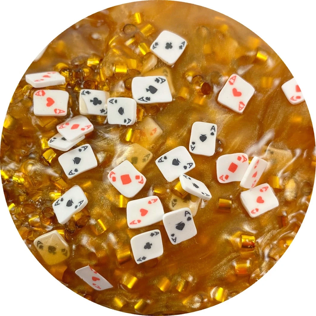 metallic gold bingsu bead slime— ultra crunchy and super pretty color! The magic card fimos throughout add the cutest touch and the bubblepops are endless🤩 scented like caramel!
