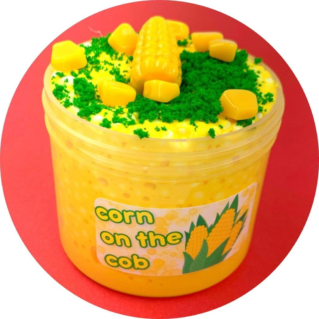 🌽Corn on the Cob! bright yellow floam with a clay slime base! comes with a corn on the cob charm & a lil bag of fake seasoning and corn pieces to top it with! super crunchy, addicting texture- smells just like sweet corn on the cob!