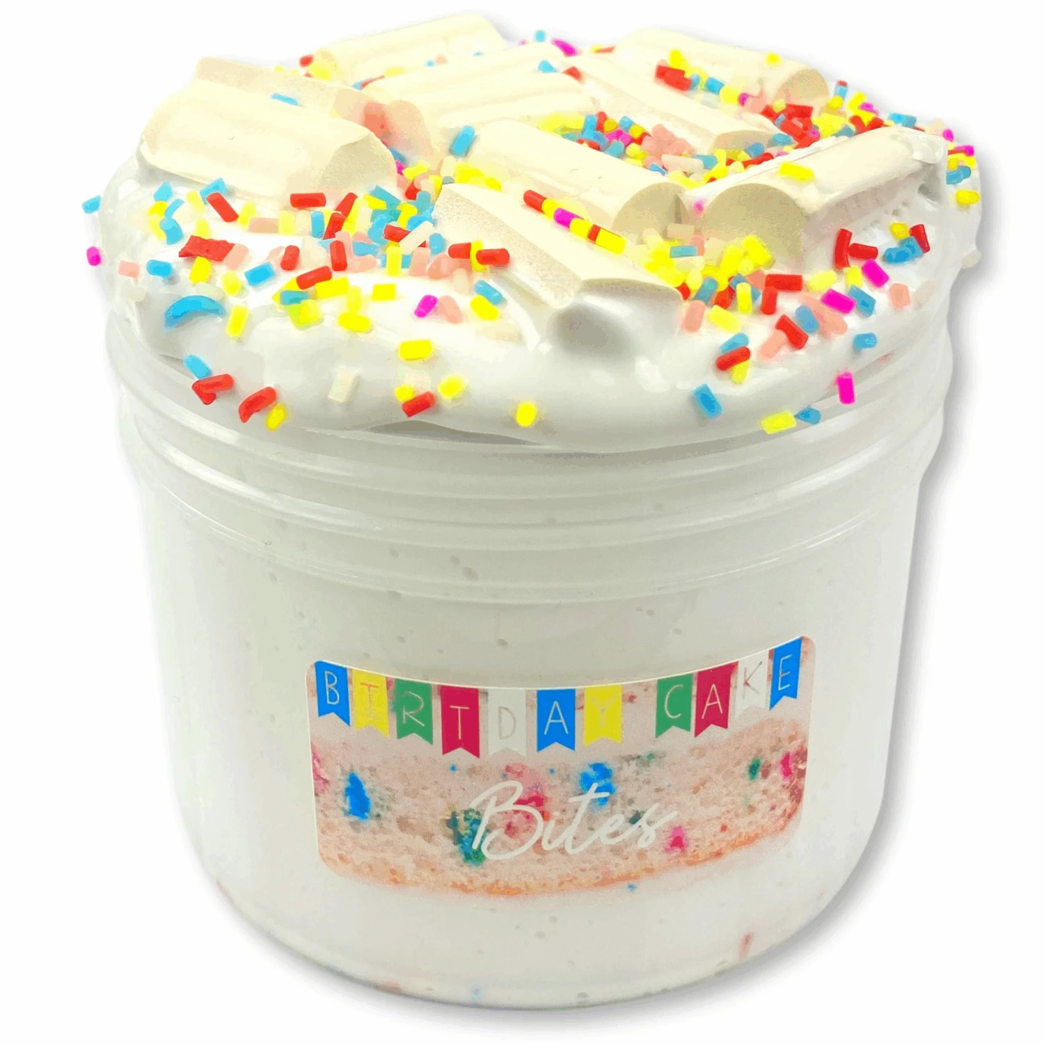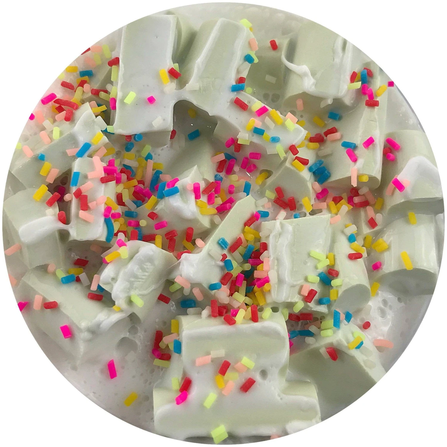This is a super creamy and glossy foam chunk slime scented french vanilla and birthday cake! Great for bubble popping. Scented birthday cake and french vanilla!