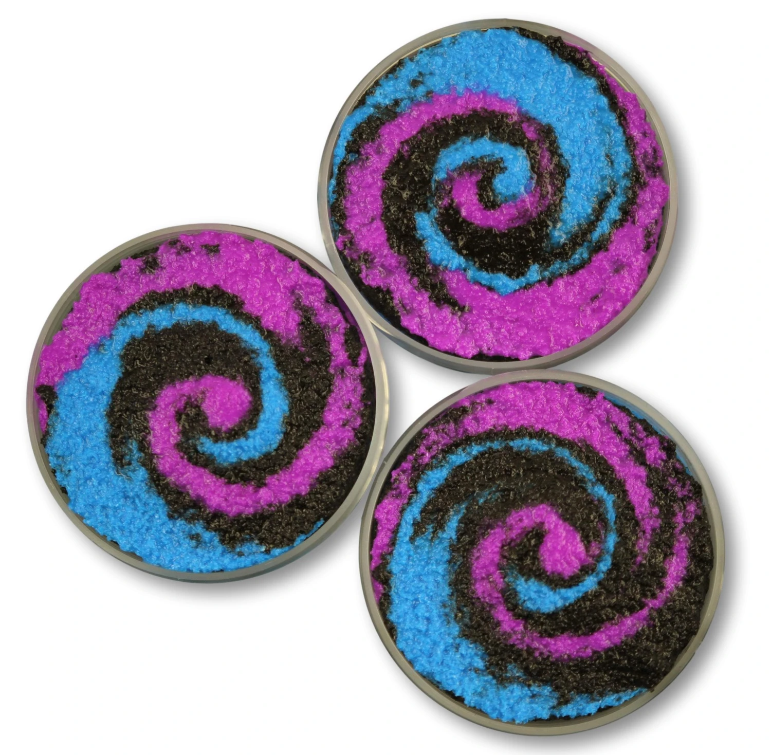 Black snow fizz slime with accents of neon blue and purple and swirled on top! Scented just like rock candy and super sizzley + crunchy texture! So fun to mix and smells amazing!