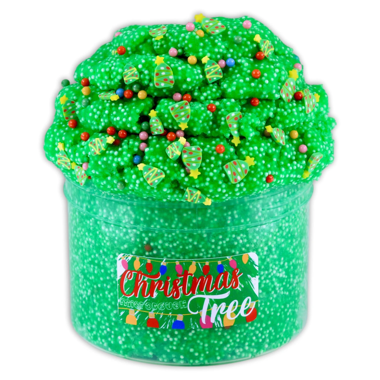 Our microDOUGH exclusive texture has been a hit so we had to create one for the holidays! Bright, vibrant Christmas green color filled with micro foam beads that give it a unique, mesmerizing feeling that you wont be able to put down. Scented strongly just like a fresh evergreen Christmas Tree & topped with mini rainbow pearls and Xmas Tree jumbo fimos!