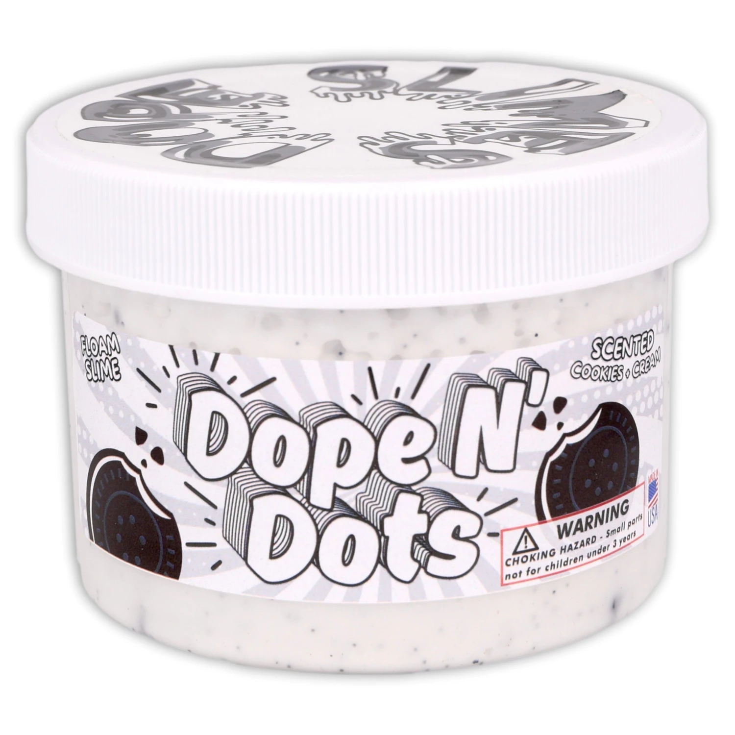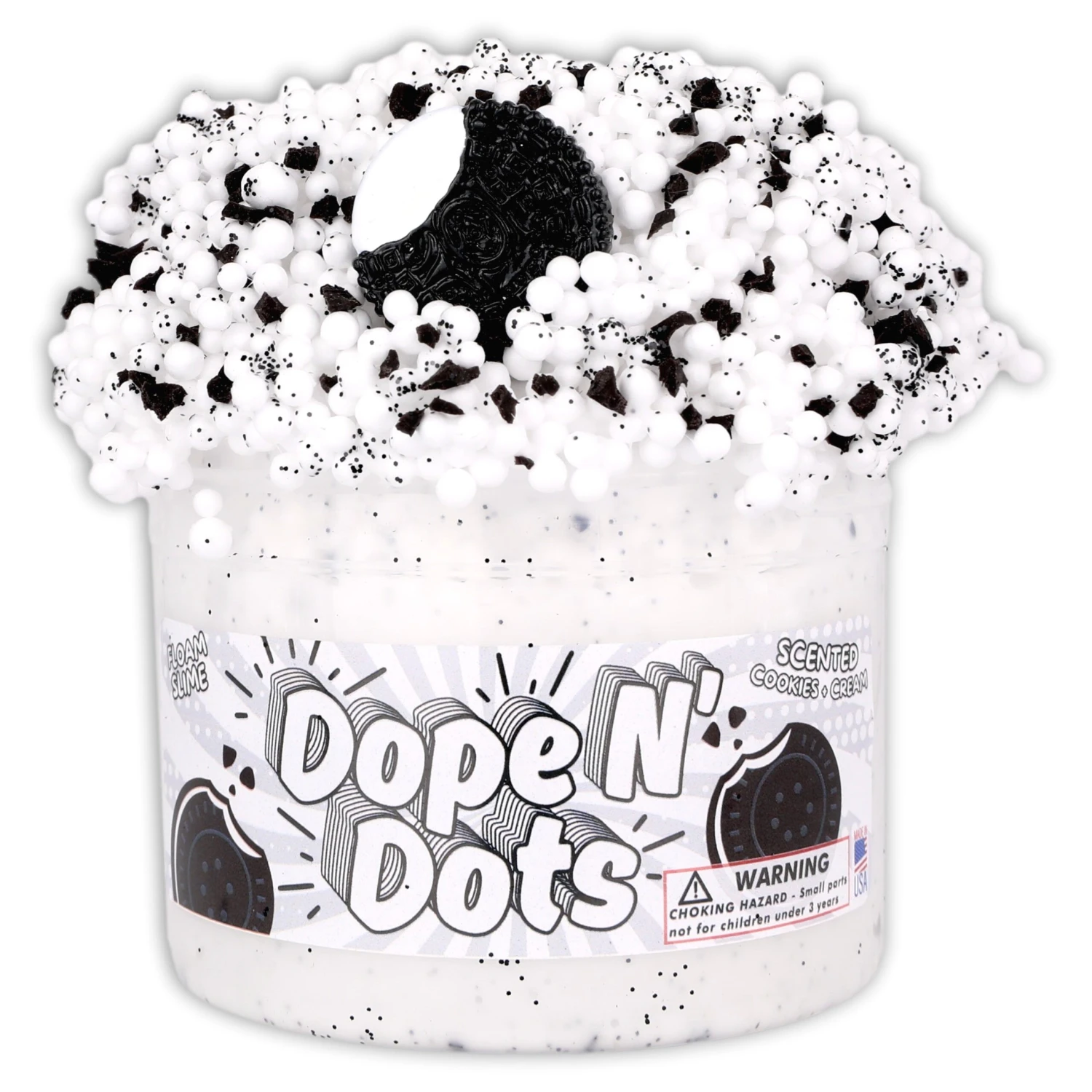 Unleash your inner child with Dope N’ Dots! Experience satisfying ASMR with our super thick base packed with black and white foam beads. Infused with the mouth-watering scent of cookies and cream. Adorned with a cookie charm, this bead packed floam slime is sure to be a sensory delight!