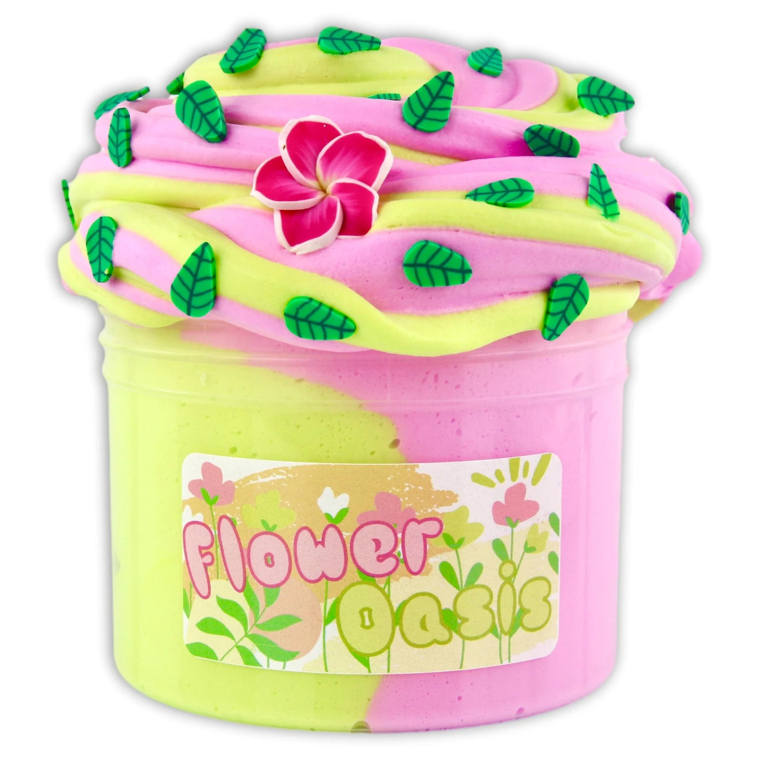 duo colored soft + soothing clay-heavy butter slime! doughy, relaxing soft texture thatโs so satisfying to blend together; mixes into a pale peach color & topped with a flower charm + leaf fimos!