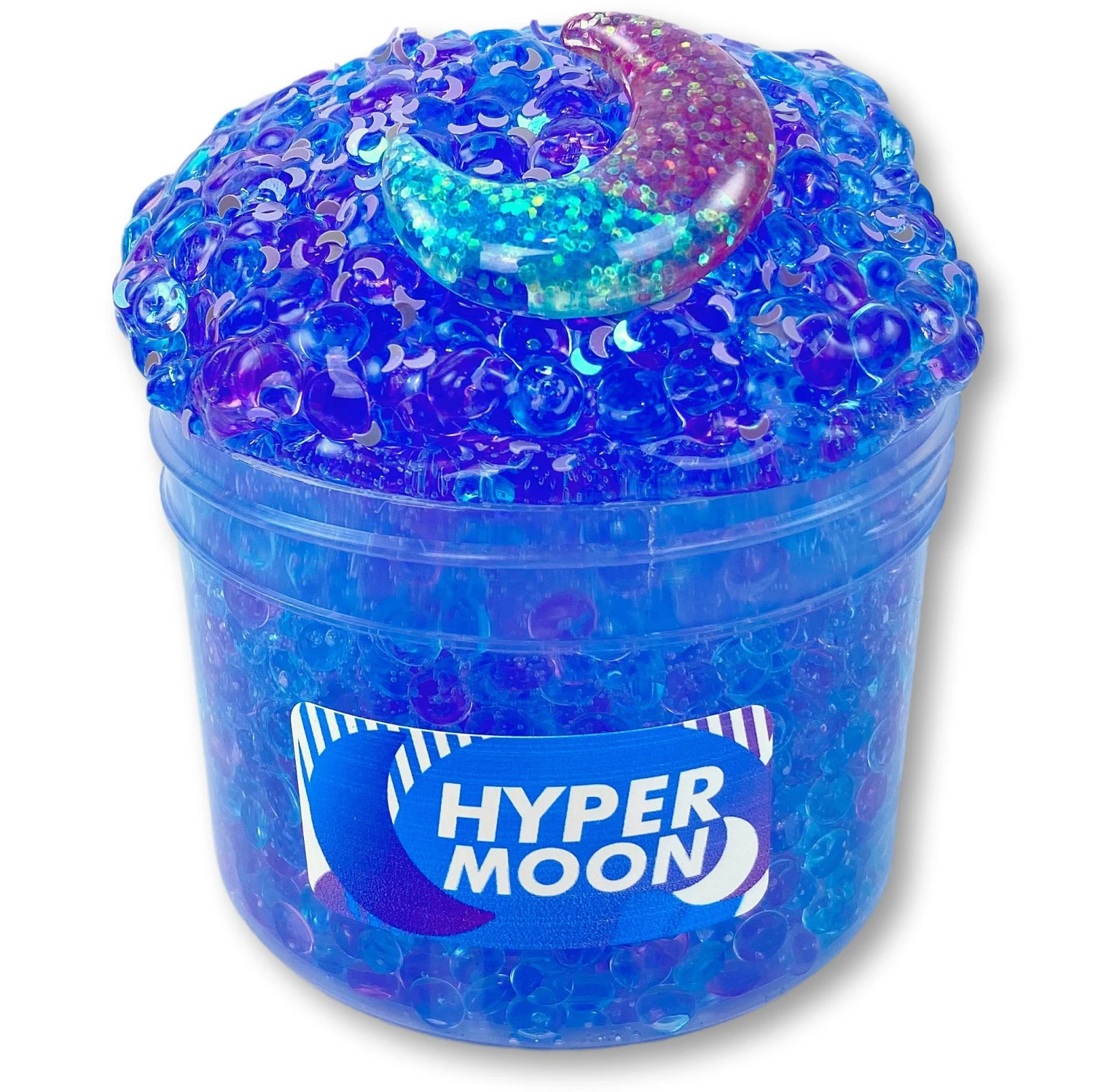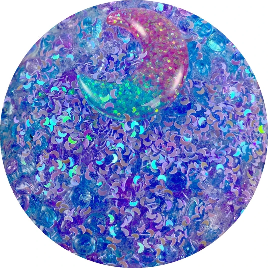 ultra clear slime packed with blue and purple fishbowl beads! tiny moon glitters throughout too and the texture is so thick and holdable yet stretchy! the color combo is sooo pretty and the moon glitters and the moon charm is super cute!