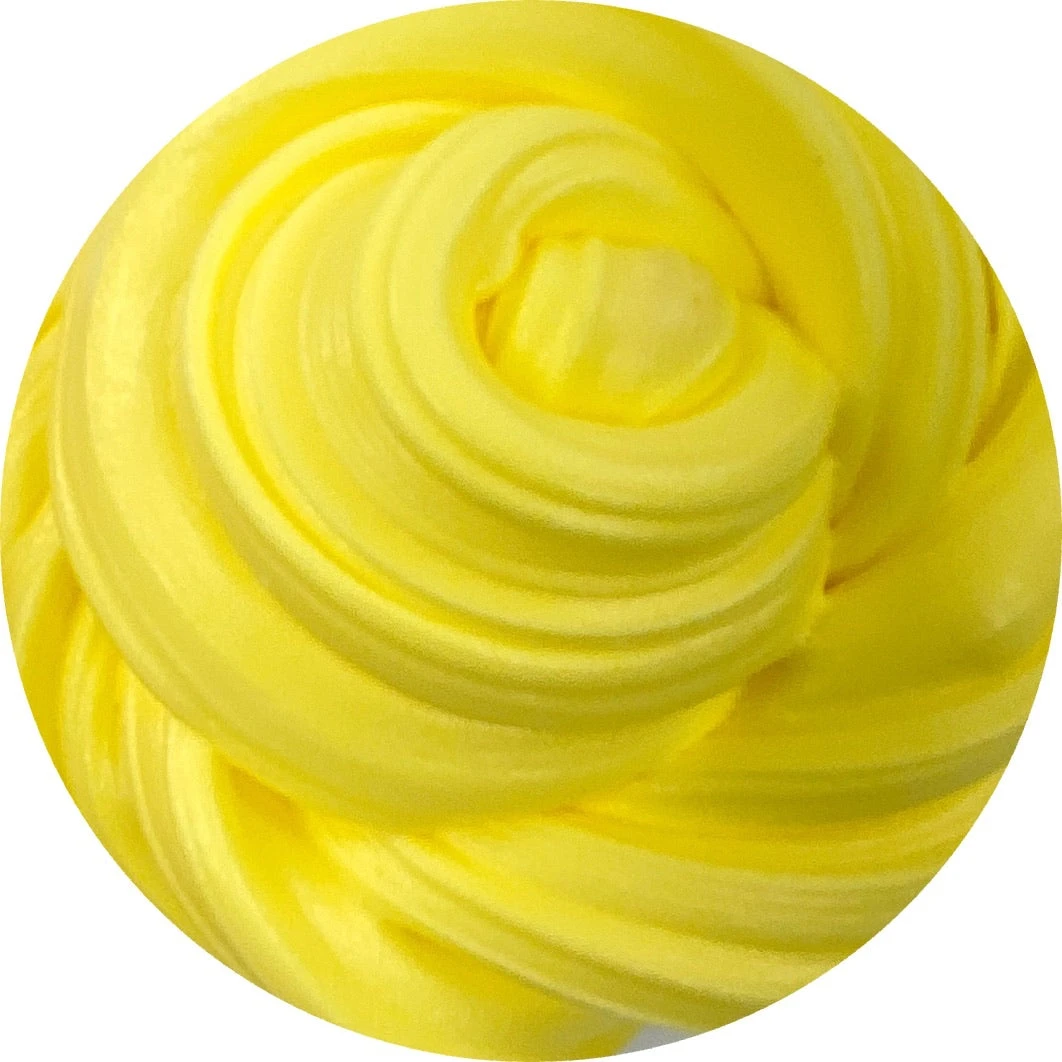 DIY thick + glossy slime with a layer of white & yellow swirled clay on top! scented just like lemon meringue pie, such a good scent and the charm and little fimos on top are the cutest touch! swipe to see the crazy inflation on this slime too— can inflate over 2x it’s original size