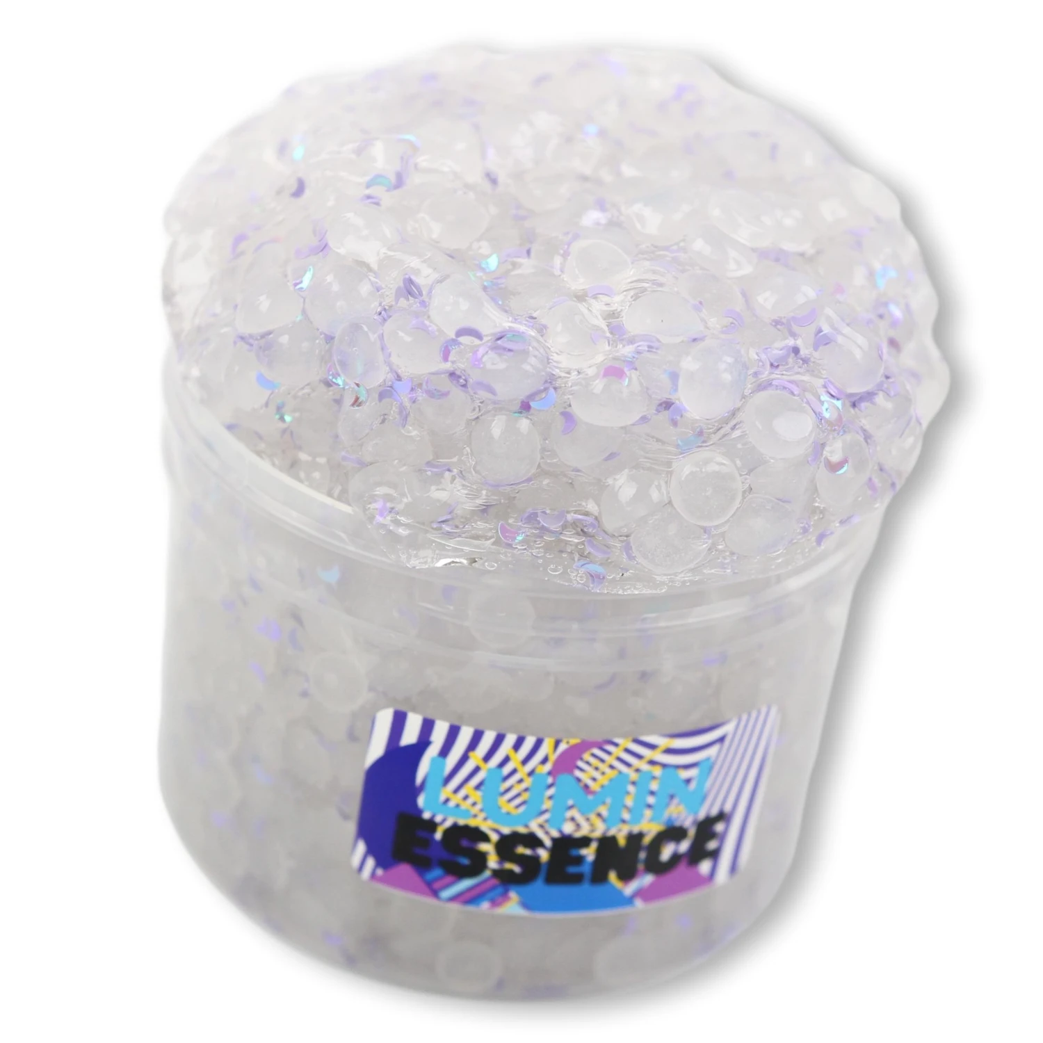 Luminescence is a super thick and stretchy glow in the dark fishbowlโ the glow in the dark beads give this a super bright glow once in the dark! Made with crystal clear slime and topped with super cute half moon glitters, is unscented to preserve clarity!