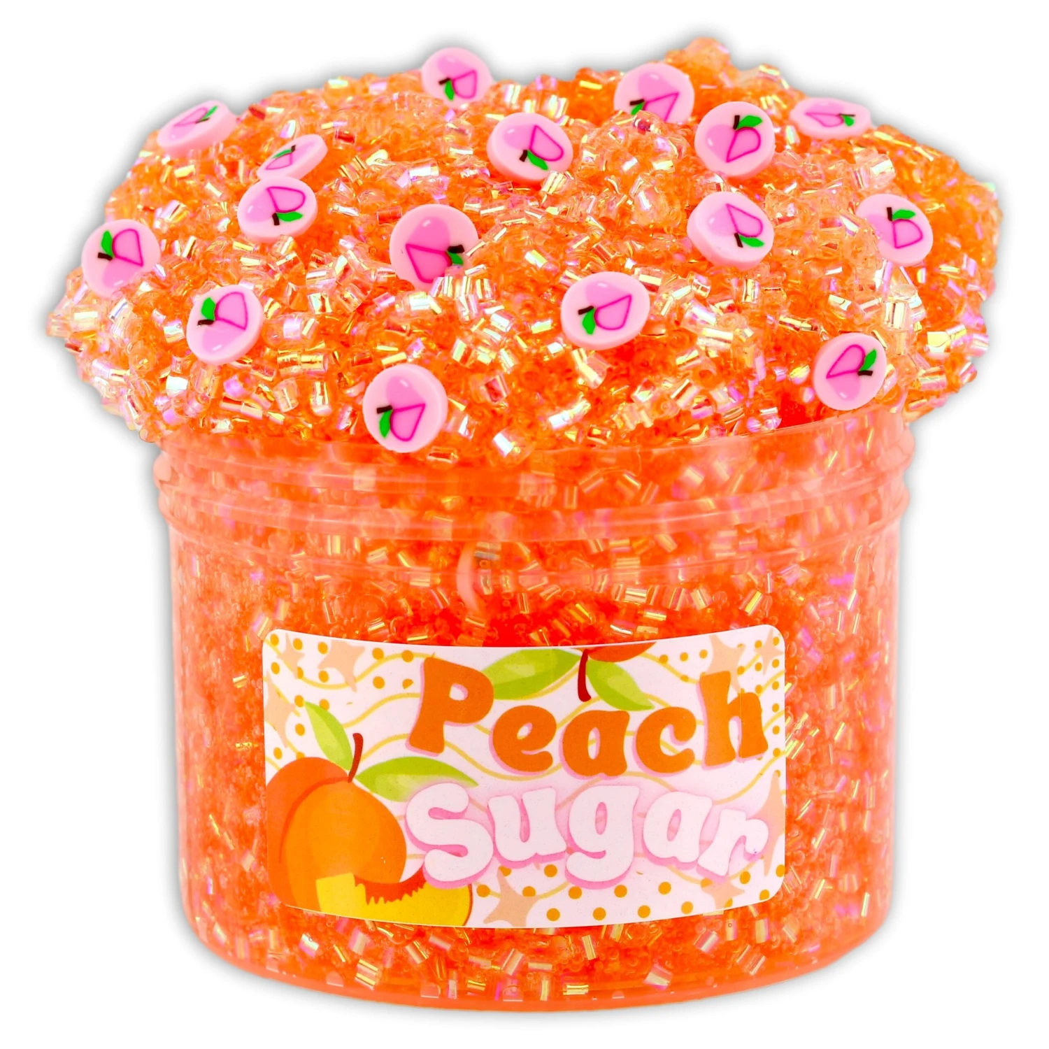 bright peach orange colored glimmering bingsu bead slime! Crunchy tactile texture – great for ASMR and makes amazing bubble pops! Topped with a sprinkle of jumbo peach circle fimos & scented just like peach sugar!