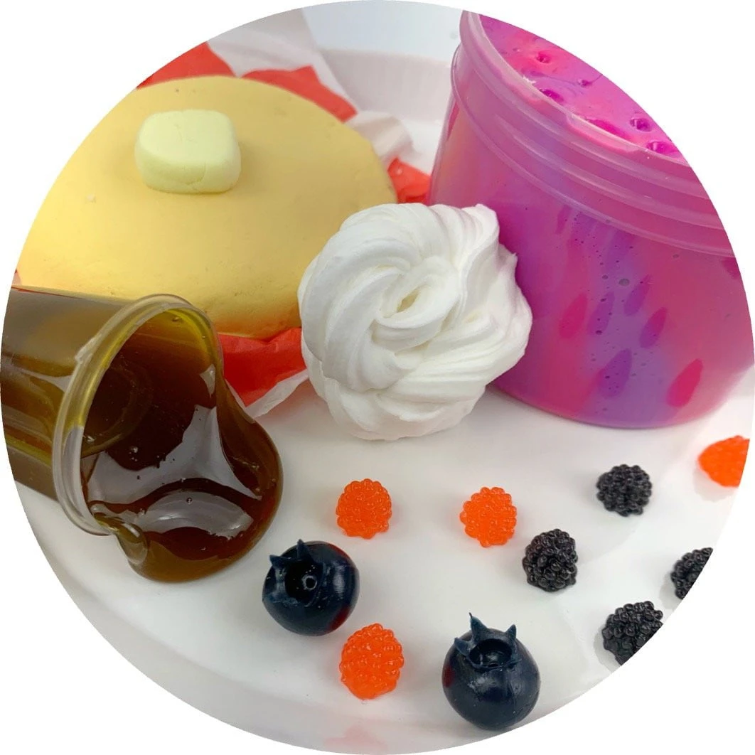 DIY clay that includes a clay pancake, a 8oz trio colored berry butter slime & 1oz of maple syrup and whipped cream clay! Smells exactly like a wildberry pancake, I mixed 4 scents and it smells delicouss, you can smell the pancake, berry, & maple syrup🤤 the end result is so good & can inflate over 32oz!!